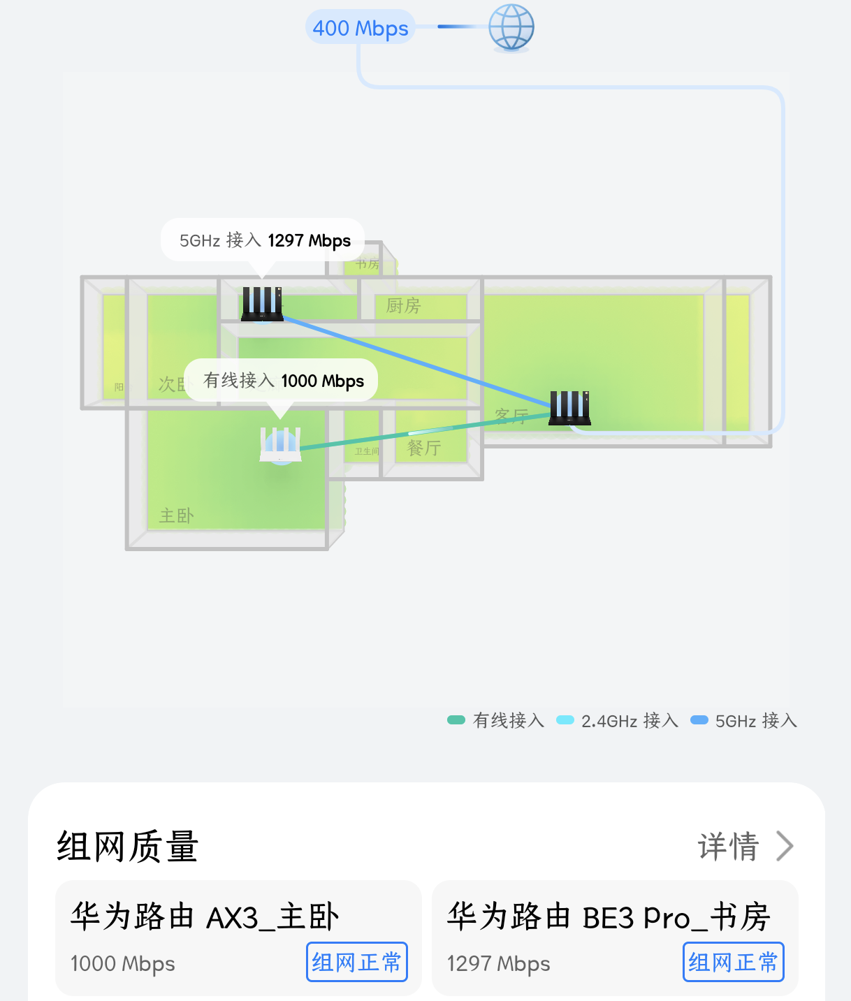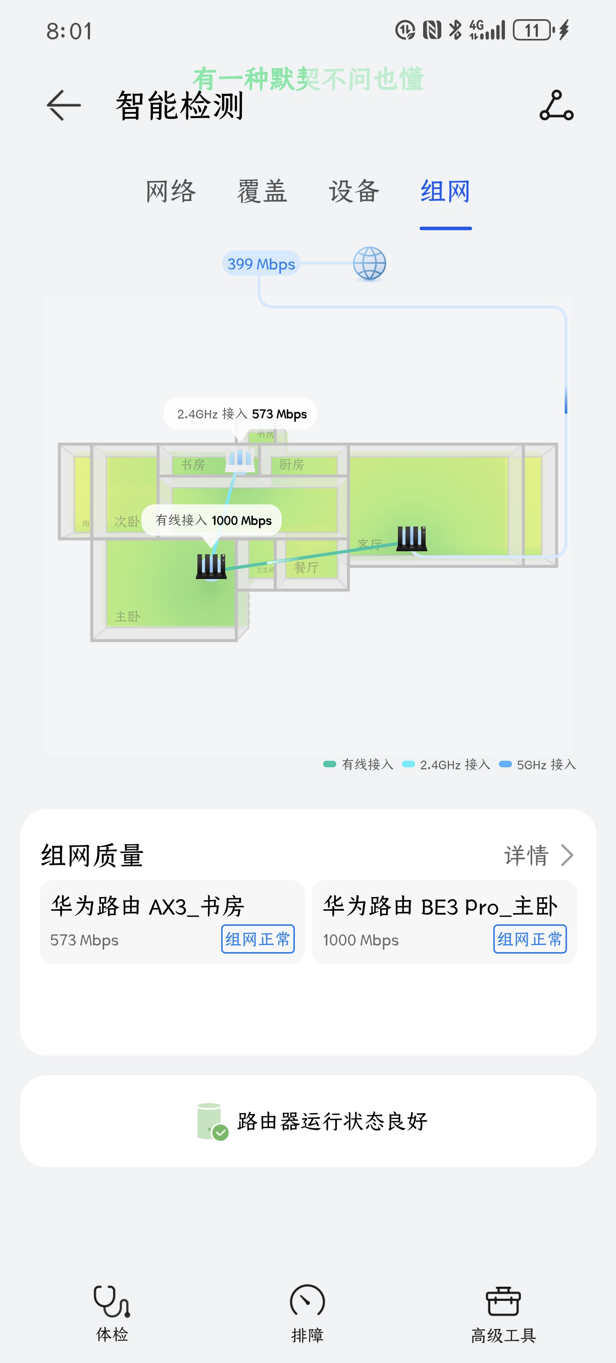 现在复盘的时候我猜测是因为AX3和BE 3 PRO两台路由器离得有点太近了所以才会出现这种情况,而且书房和客厅中间、书房和主卧之间的墙都很厚。